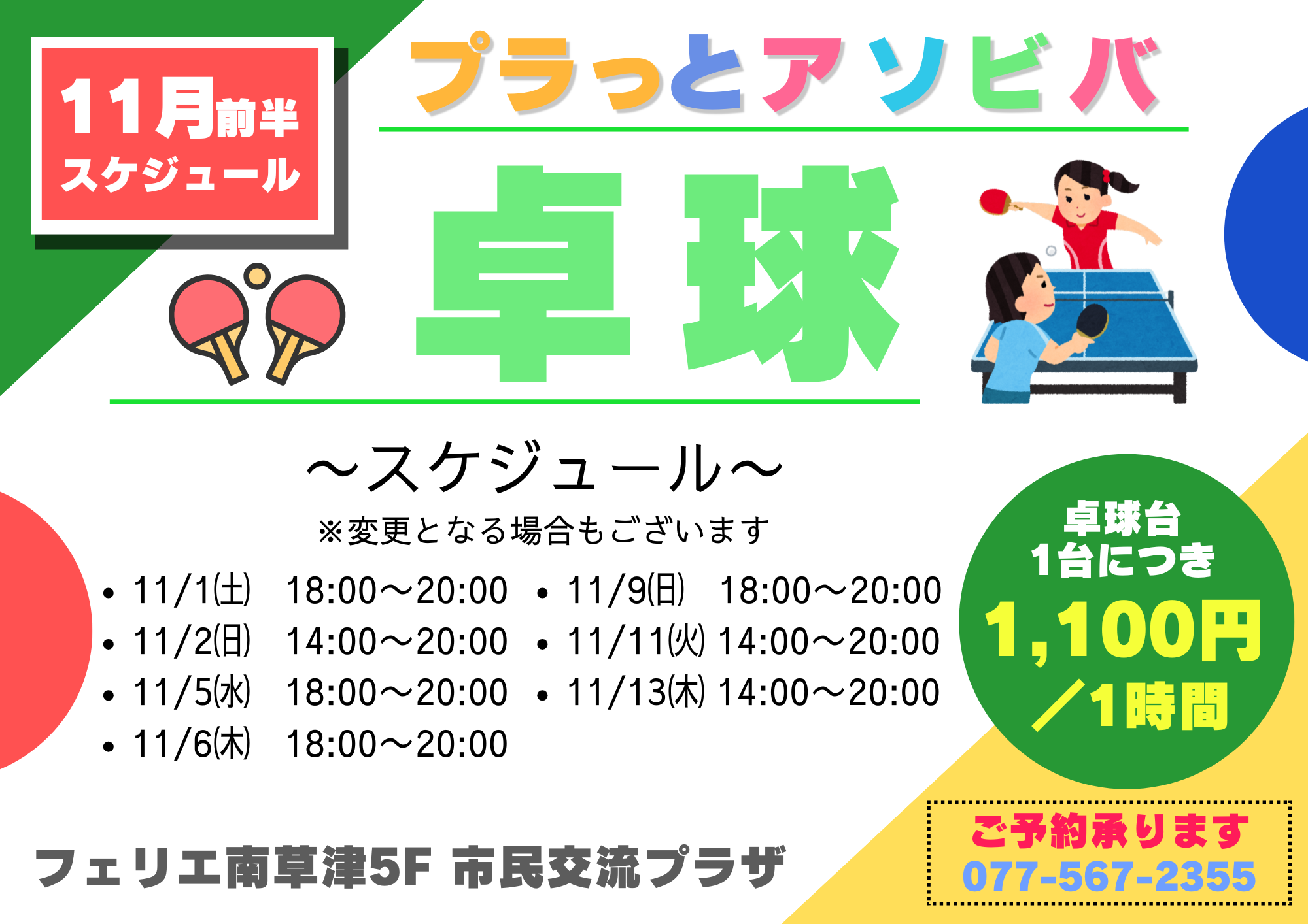 2025.10.29 お知らせ / イベント・教室・講座情報 / インフォメーション / 教室情報 / 更新情報南草津駅周辺で気楽に卓球ができる場所をお探しの方へ