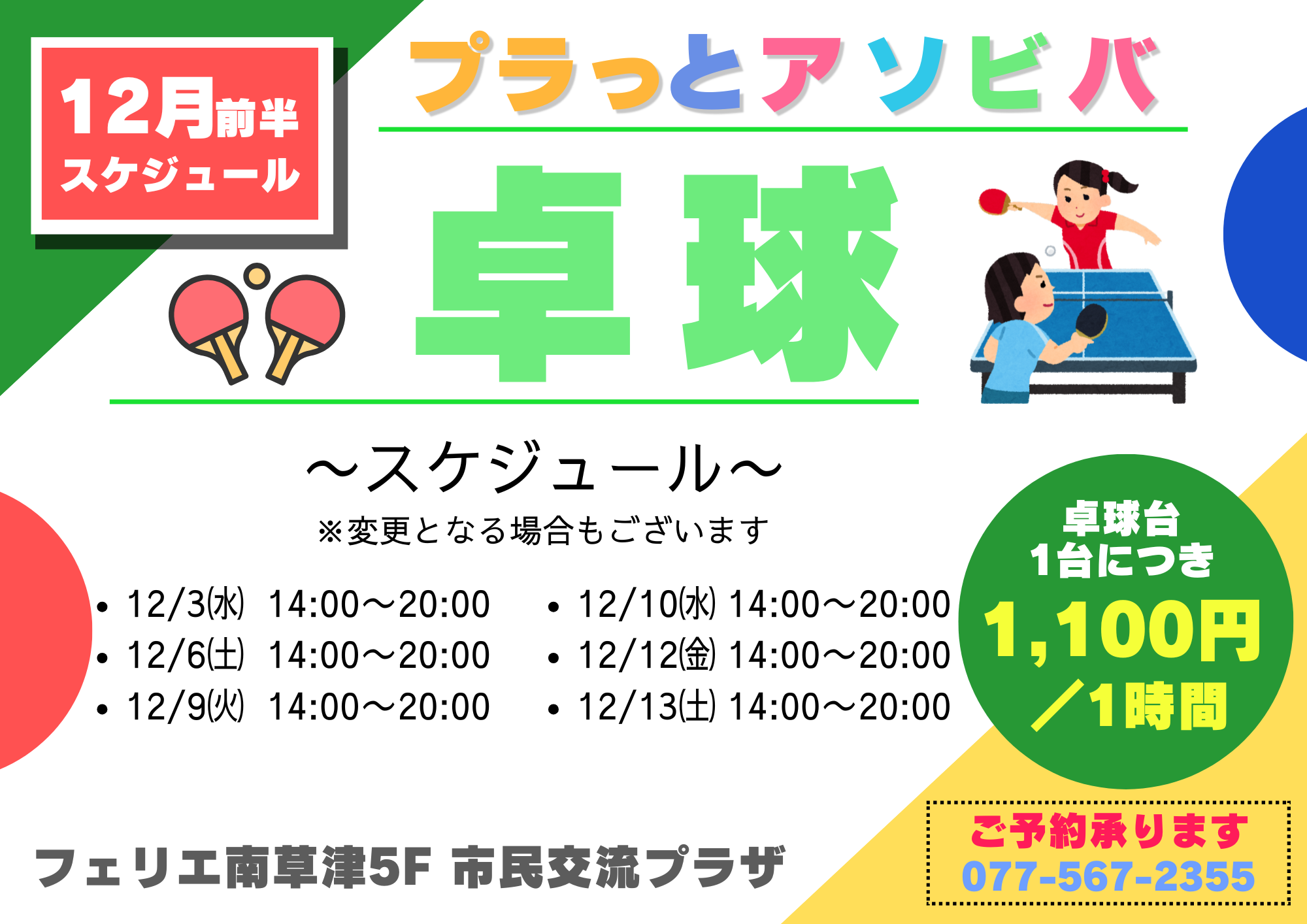 2025.11.28 お知らせ / イベント情報 / イベント・教室・講座情報 / インフォメーション南草津駅周辺で気楽に卓球ができる場所をお探しの方へ
