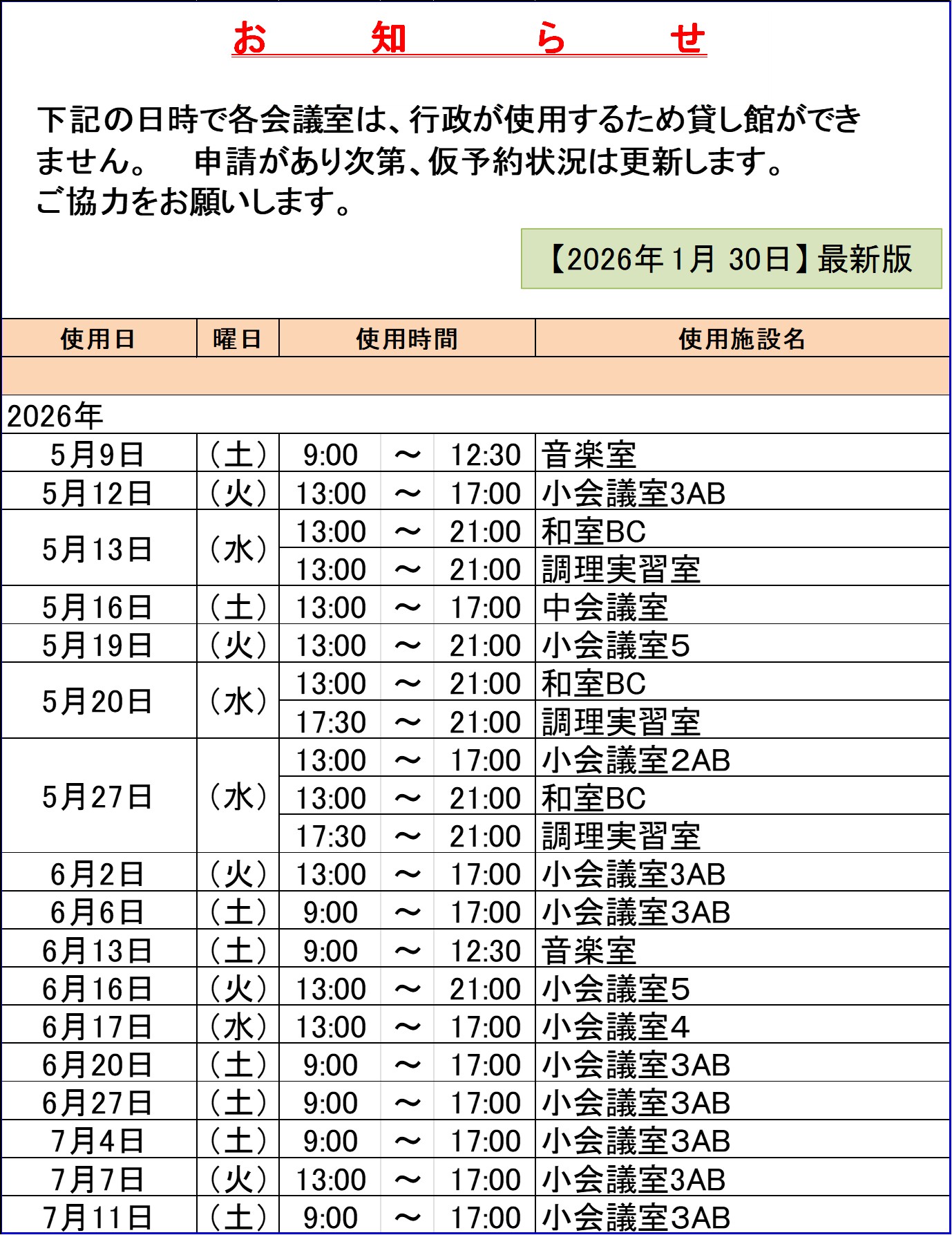 行政仮予約状況(2026年 1月 30日 現在)